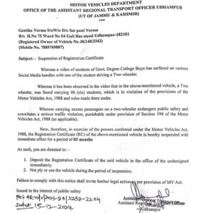 Scooty RC Suspended After Viral Video in Udhampur Udhampur, December 15: The Registration Certificate (RC) of a scooty bearing Registration No. JK14K-3342 has been suspended for a period of three (03) months with immediate effect. The action was taken after a video went viral on social media showing a two-wheeler carrying six (06) students, an act amounting to gross violation of traffic rules and endangering public safety. The incident reportedly involved GDO Boys in the Udhampur area. Taking cognizance of the matter, the Assistant Regional Transport Officer (ARTO), Udhampur, ordered the suspension of the vehicle’s RC under the relevant provisions of the Motor Vehicles Act. The Transport Department has reiterated that such reckless and dangerous acts will be dealt with strictly, and parents, students, and vehicle owners are advised to ensure compliance with traffic laws to avoid legal action. Issued by: Assistant Regional Transport Officer Udhampur